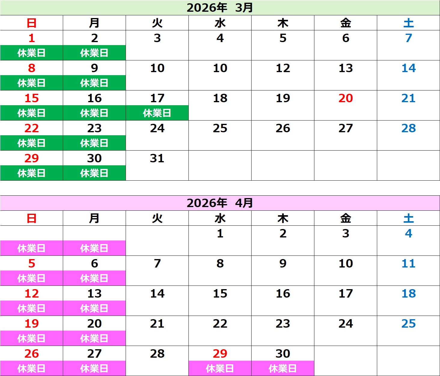 5日(日)・6日(月)・12日(日)・13日(月)・19日(日)・20日(月)・26日(日)・27日(月)・29日(水・祝)・30日(木) -